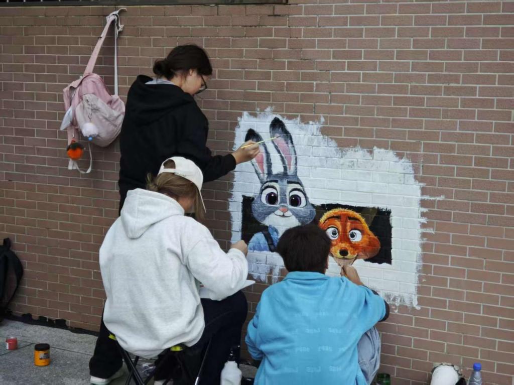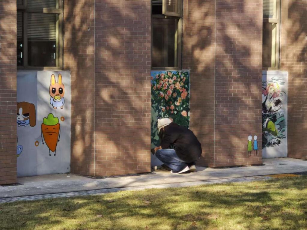 该活动以党员先锋为引领、团学干部为骨干,聚焦理想信念引领与校园文化建设,紧扣时代主题与青春内涵创作内容。团队成员发挥专业所长、分工协作,历时一周完成15个老旧墙面焕新改造,将斑驳单调的灰色空间升级为格调向上的文化景观。作品落地后迅速引发校园热潮,累计吸引师生驻足打卡1.8万余次,收到师生留言200余条,成为传递正能量、涵养品德修养的育人阵地。