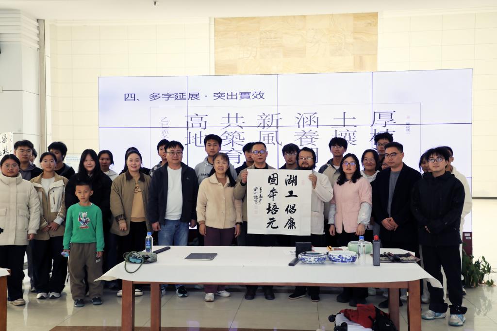 活动现场,许正扬以“廉”为核心创作主线,挥毫泼墨间完成了“强化清廉引领、规范权力运行、护航湖工发展”“清风沐校园 廉洁伴成长”等20余幅主题书法作品。同时,现场指导师生书法技巧,分享“笔墨言志、廉洁修身”的感悟,让师生在艺术熏陶中深化对廉洁理念的理解。