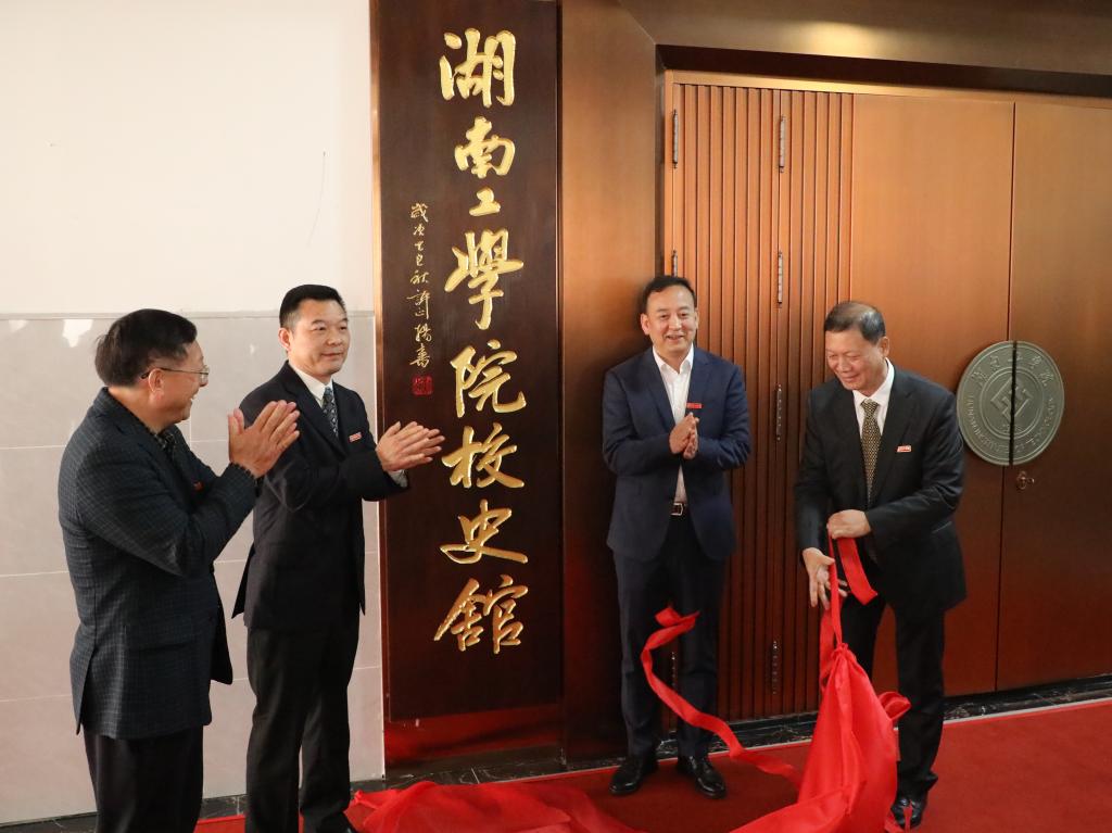 校党委书记曹执令、校党委副书记、校长曾广胜与学校老领导张力、罗建华共同为校史馆揭牌