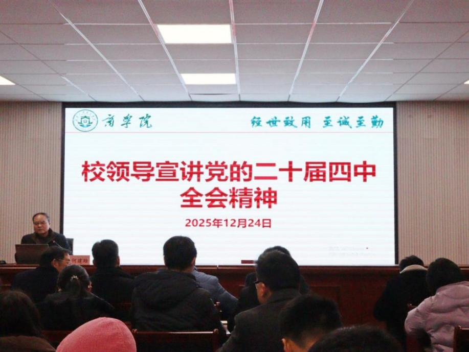 12月24日下午,校党委副书记何建雄在经管楼302专题宣讲党的二十届四中全会精神。组织部、教务处、教学质量建设与评估处、创新创业教育中心、少数民族预科教育部、现代工程技术实践教学部副科级以上干部及商学院全体教职工参加学习。