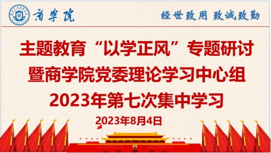 8月4日,商学院党委在经315会议室召开了党委理论学习中心组2023年第七次集中学习暨“以学正风”专题研讨,党委理论学习中心组全体成员参加,学习由党委书记曹文明主持。