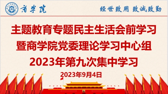 9月4日,商学院党委理论学习中心组在经315会议室举行主题教育专题民主生活会前学习暨2023年第九次集中学习,深入学习领会习近平总书记关于党的建设重要思想、习近平总书记关于严肃党内政治生活的重要讲话和重要指示批示精神,习近平总书记关于“以学铸魂”“以学增智”“以学正风”“以学促干”等重要论述,习近平总书记关于教育的重要论述,学习党章、新形势下党内政治生活若干准则、县以上党和国家机关党员领导干部民主生活会若干规定等党内法规,聚焦专题民主生活会主题,强化党的创新理论武装,增强深化自我革命的政治自觉,为高质量开好专题民主生活会打牢思想和理论基础。学习由党委书记曹文明主持。