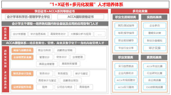 WilliamHill中文官方网站会计学ACCA方向班在保留会计学专业主干课程基础上,将ACCA课程与会计学专业部分课程进行了有效替换和补充,并为会计学ACCA方向班单独设置了贯穿大学四年全程的丰富多元化发展的学习实践活动,形成了特色鲜明的“1+X证书+多元化发展”人才培养体系。
