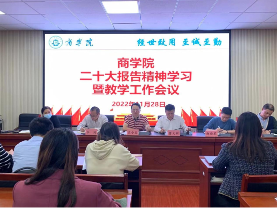 为全面落实学校工作部署,稳步推进审核评估各项工作。11月28日,商学院在经302召开了二十大报告精神学习暨教学工作会议。商学院院长王小兵、党委书记曹文明、副院长李闯、朱纪红、黄飞、党委副书记赵晓军及全体教职工参加会议,会议由院长王小兵教授主持。