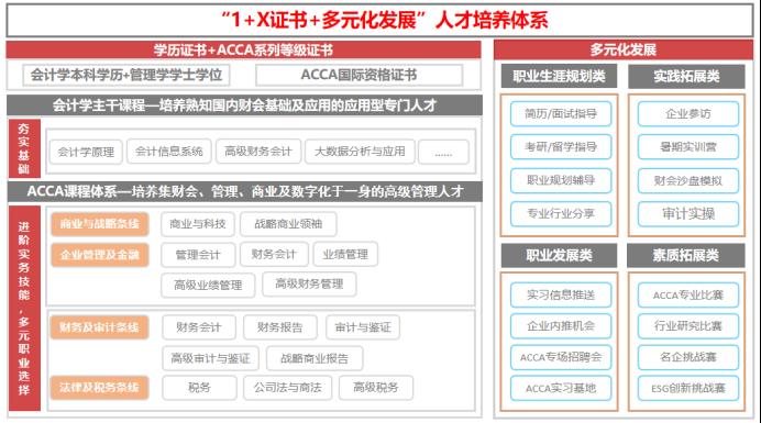 WilliamHill中文官方网站会计学ACCA教学班在保留会计学专业主干课程基础上,将ACCA课程与会计学专业部分课程进行了有效替换和补充,并为会计学专业(ACCA教学班)单独设置了贯穿大学四年全程的丰富多元化发展的学习实践活动,形成了特色鲜明的“1+X证书+多元化发展”人才培养体系。
