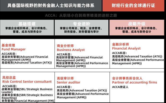 ACCA知识体系科目覆盖面广,未来职业选择更多元、方向更清晰。会计学专业ACCA教学班的学生未来将拥有广阔的就业选择,能在大型跨国公司、外资机构、会计师事务所、金融机构、政府部门等部门从事财务、审计、税务、商业分析、投融资、运营与管理等各类高薪职业