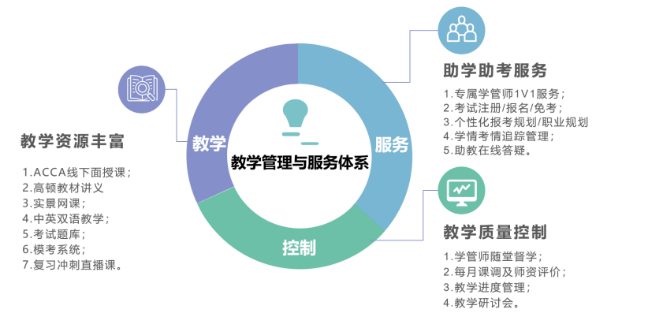 除了配备常规教辅老师负责日常教学与管理之外,本专业额外配备了专职班主任与学管老师,对同学们进行ACCA新学员注册/报考/备考等全过程细致辅导并通过教学研讨会、每月课调、学服督学等措施严格把控教学质量,帮助学生高效完成各阶段学习任务,提高ACCA考试通过效率。