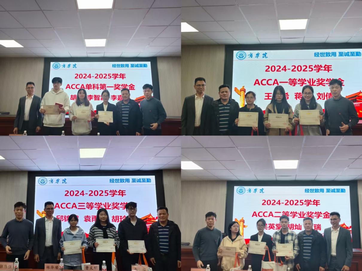 颁奖典礼环节,与会领导分别为2024-2025学年“ACCA单科第一奖学金”、“ACCA学业奖学金”获得者颁发证书和奖品。