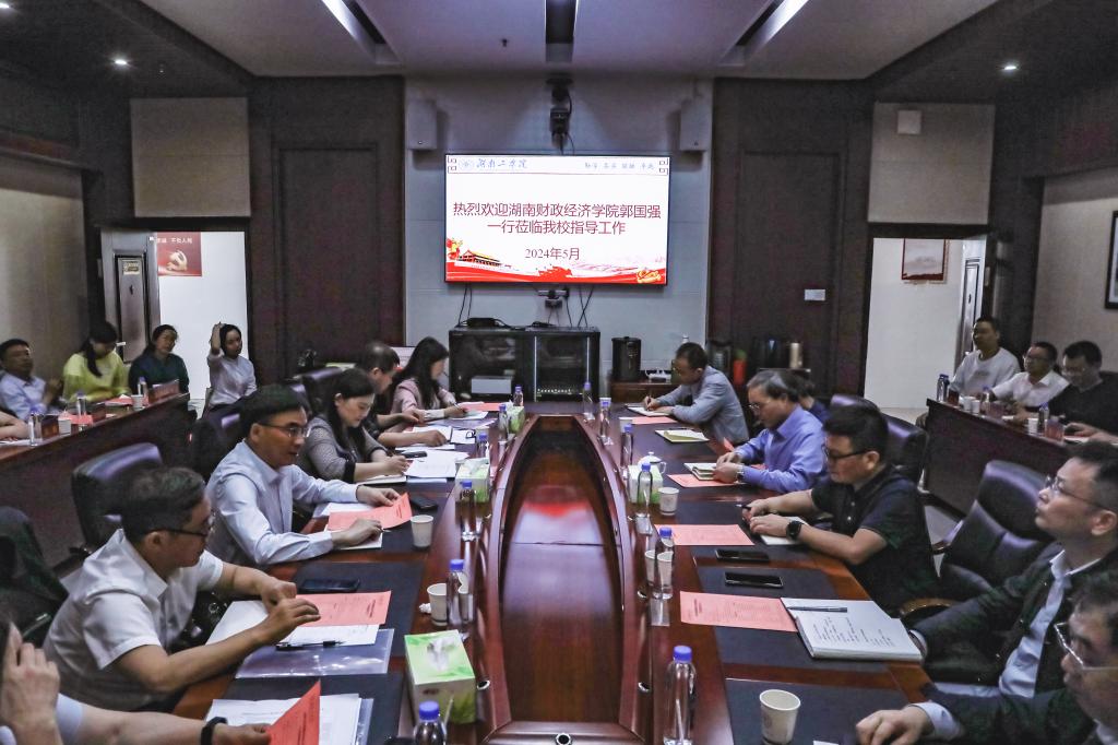 5月7日,湖南财政经济学院党委委员、副校长郭国强一行17人来校交流本科教育教学审核评估工作。会议在教学大楼12楼会议室召开,学校党委副书记何建雄出席交流会,教学质量建设与评估处处长彭志忠主持会议。