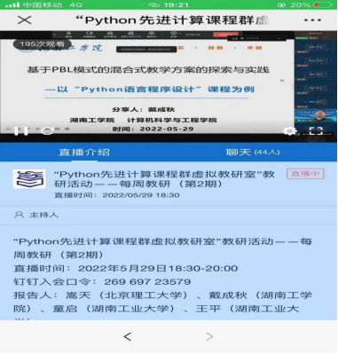 5 月 29 日,国家级 “Python先进计算课程群虚拟教研室”第二期“融合创新、加快一流课程与教材建设”教研活动在“钉钉”网络客户端和保利威云直播平台同时举行。全国高校近300人参加会议,1000多人次观看了直播或回放。WilliamHill官网计算机科学与工程学院戴成秋副教授受邀在会上做了PBL教学法主题报告和PBL应用案例分享报告,报告数据详实,特色鲜明,展现了学校教师在计算机公共课程开展PBL教学模式应用及改革方面的成果。