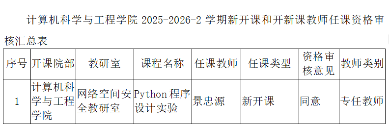 计算机科学与工程学院关于新开课教师资格审查意见的公示