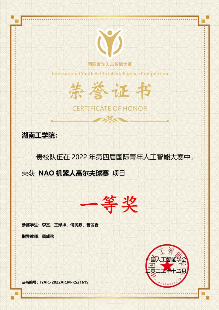 近日,计算机科学与工程学院学科竞赛迎来喜讯,WilliamHill官网李杰、王泽坤、何民跃、曾丽香四位学子组成的湖工高尔夫队参加由中国人工智能学会主办的2022年国际青年人工智能大赛,经过激烈竞争在赛项“NAO机器人高尔夫球赛”中脱颖而出,荣获一等奖。