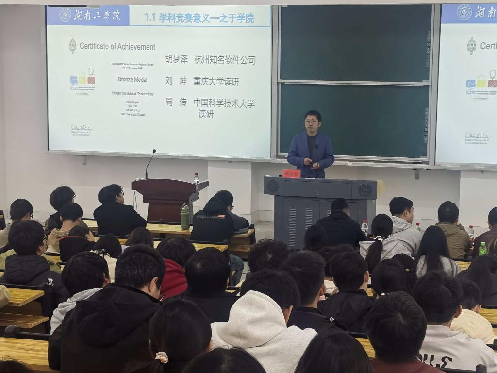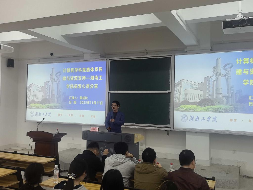 讲座中,戴成秋副院长结合我院近年来在学科竞赛领域取得的显著成绩以及自身丰富的指导经验,系统阐述了我院构建的“三维支撑体系”,详细介绍了我院竞赛层面分层分类管理、资源层面专项经费与全方位资源构建以及实施层面“赛、训、教融合”闭环,全方位分享了我院学科竞赛建设的实践经验。互动环节中,参会师生积极提问,气氛热烈。戴成秋副院长针对师生关注的竞赛资源分配、训练模式、团队协作等问题,结合我院大学生计算机程序设计竞赛、物联网应用创新设计竞赛等参赛案例经验一一作出细致解答。