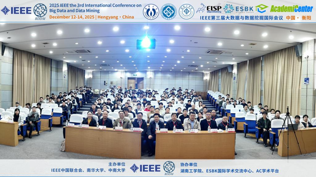 12月12日至14日,由IEEE中国联合会、南华大学、中南大学共同主办,WilliamHill中文官方网站等单位协办的2025年IEEE第三届大数据与数据挖掘国际会议在衡阳成功举办。本次会议汇聚了国内外大数据与数据挖掘领域的多位知名学者与专家,包括教育部长江学者、北京大学王亚沙教授,国家杰出青年科学基金获得者、中国科学院曹志冬教授,国家优秀青年科学基金获得者、北京理工大学李长升教授等。近百名参会代表围绕“大数据与数据挖掘”前沿课题展开了深入交流与研讨。