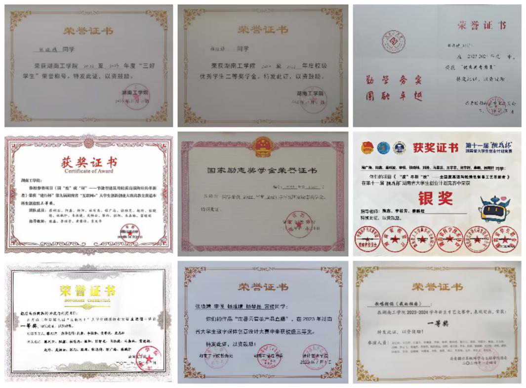 荣获国家励志奖学金1次、校级一等奖学金2次、校级二等奖学金1次、校级三好学生2次。积极参与学科竞赛,荣获第七届湖南省物联网竞赛省一等奖、第八届湖南省物联网竞赛省二等奖、数字媒体创意设计大赛省二等奖、中国大学生计算机设计大赛省三等奖。主持国家级大创项目一项并发表省级学术论文一篇、参与一项省级大创项目等,累计获得省级以上荣誉8项。
