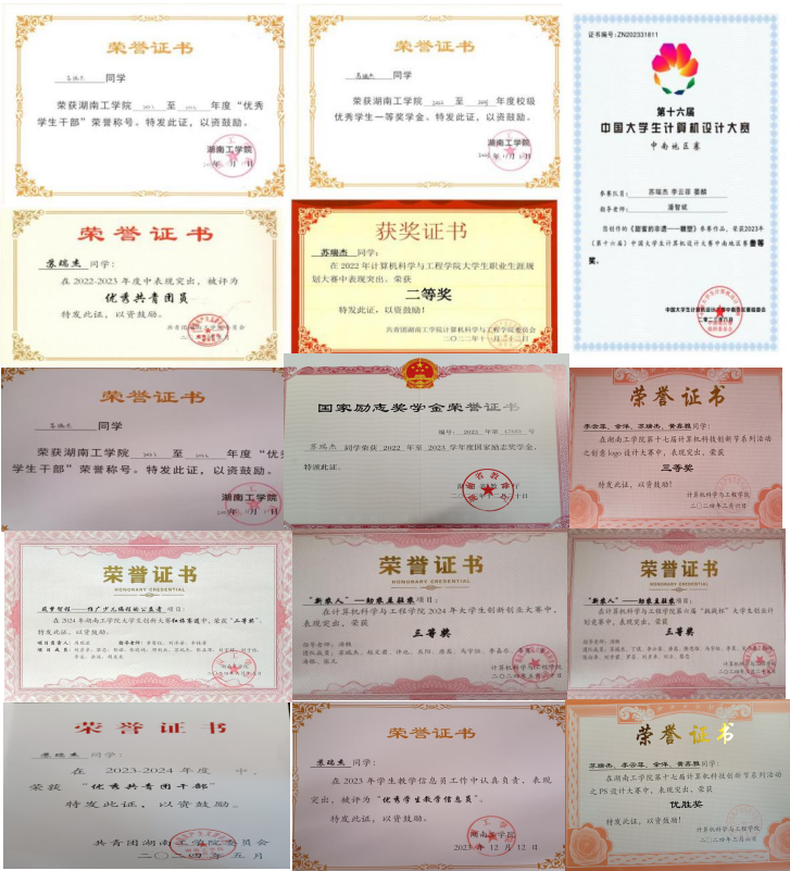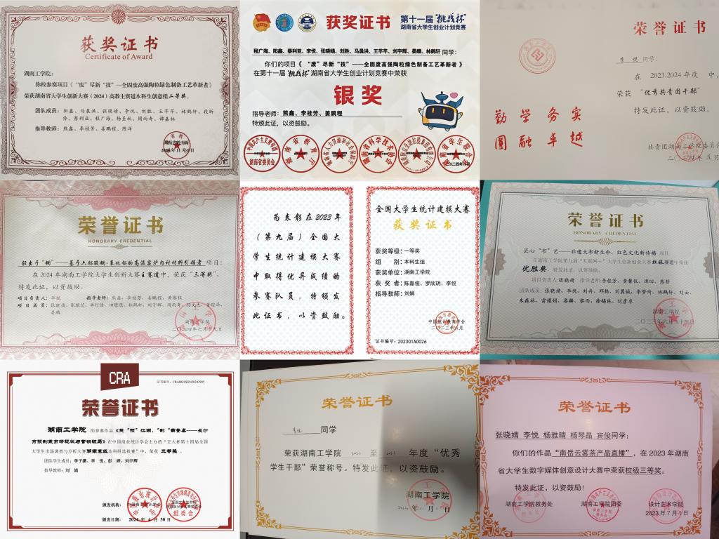 荣获国家励志奖学金2次、校级一等奖学金1次、校级二等奖学金1次、校级三好学生2次、校级三好学生标兵1次、校级优秀共青团员1次。在校期间积极参加比赛,曾获湖南省大学生创新大赛(2024)二等奖、第十一届“挑战杯”湖南省大学生创业计划竞赛银奖。累计获得省级奖项3项、校级奖项10项、院级奖项15项。