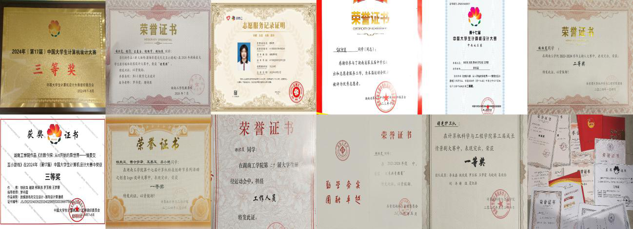 荣获国家励志奖学金1次、校级一等奖学金1次、校级优秀学生干部1次、校级优秀共青团员1次、校级三好学生1次。综测成绩排名专业第一。在校期间参加中国计算机设计大赛、全国大学生数字媒体科技作品及创意竞赛、湖南省大学生计算机程序设计竞赛、湖南省大学生数字媒体创意设计大赛等多项比赛并荣获国家级奖项2项、省级奖项6项、主持省级大创项目一项。