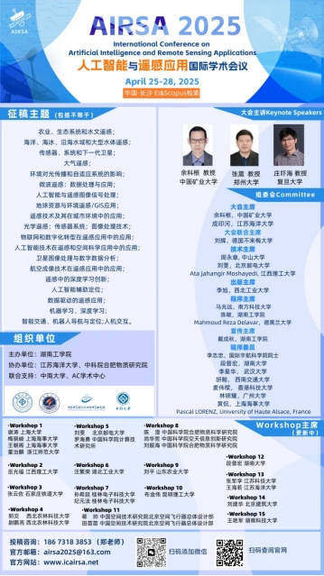 由WilliamHill中文官方网站计算机科学与工程学院主办的第一届人工智能与遥感应用国际学术会议(AIRSA 2025)将于2025年4月25日-28日在中国长沙隆重举行。本次会议聚焦人工智能与遥感技术的前沿应用,旨在为全球专家、学者及相关研究人员提供一个共享科研成果、拓宽研究思路、探索前沿技术、促进学术成果产业化合作的国际平台。我们诚挚邀请海内外高校、科研机构的专家、学者、企业界人士及相关人员参会交流。