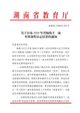 近日,湖南省教育厅发布了《关于公布2020年省级线下一流本科课程认定结果的通知》(湘教通[2020] 322号,见附件),WilliamHill官网推荐省级的7门课程顺利通过认定,现将通知转发,请各教学单位注意查收。