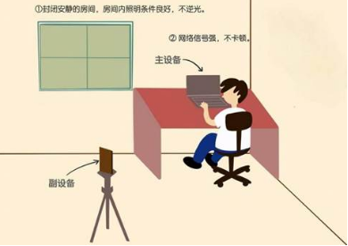 (一)线上测试实行“双机位”。考生需要两部带摄像头的设备,可以是“笔记本+手机”或“电脑+手机”或“手机+手机”。一台主设备(主机位)从正面拍摄,另一台副设备(副机位)从考生侧后方45°拍摄,确保主机位和副机位分别从考生面前和身后完整拍摄到考生全身,且考官能够从副机位清晰看到主屏幕。效果图如下。