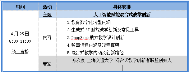 为贯彻落实全国教育大会和教育部高教司文件精神,推动人工智能赋能教育,培育及建设智慧课程、AI课程,有效推进混合式教学的深度落地,教师发展中心将组织“拥抱AIGC浪潮:高校智慧课程全流程孵化与AI驱动混合式教学创新工作坊”培训工作,现就有关事项通知如下: