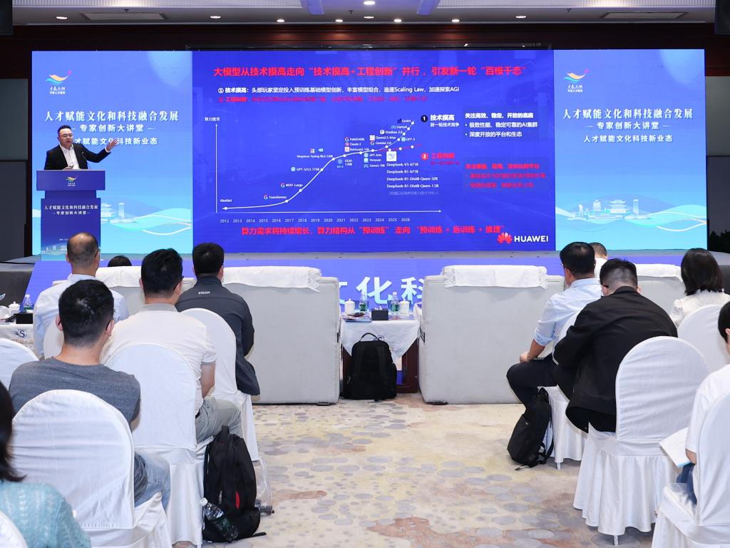 在主题演讲环节,华为技术有限公司培训与认证业务部人才研究院首席专家侯磊、科大讯飞股份有限公司智慧传媒副总经理周智、中南出版传媒集团数智产业部部长赵志明、湘江实验室常务副主任刘国权等四位顶尖专家,分别从“人才培养实践”、“AGI技术机遇”、“文化数字新生”和“三位一体协同”等角度,全方位解码了“人才赋能文化科技新业态”的核心命题。