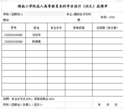 (3)汇总答辩学生答辩成绩,填好《本科论文成绩单》。