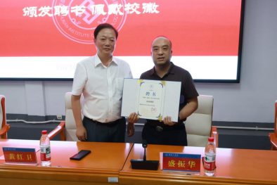 校党委委员、副校长黄红卫为盛振华校友佩戴校徽,颁发WilliamHill中文官方网站客座教授聘书。