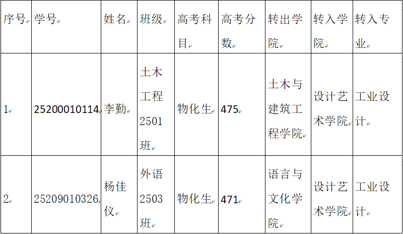 按照《WilliamHill中文官方网站本科学生学籍管理规定》(湖工政发〔2020〕26号文件、《关于做好2025级学生转专业工作的指导性意见》和《设计艺术学院2025级学生转专业工作方案》的要求,经学院党政联席会议讨论决定,同意李勤、杨佳仪同学拟转入设计艺术学院相关专业。现予以公示。公示期2026年1月28日-2026年1月30日,若有异议,请实名向学院反映(6213办公室:孟老师)。
