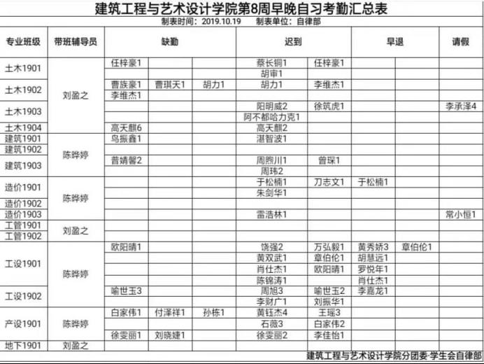 建筑工程与艺术设计学院第8周早晚自习考勤汇总表