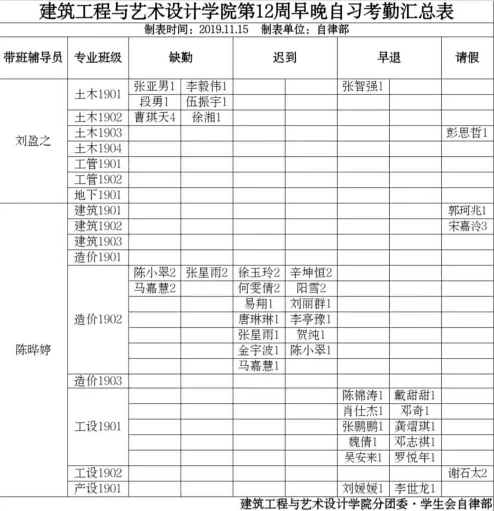 建筑工程与艺术设计学院第12周早晚自习考勤汇总表