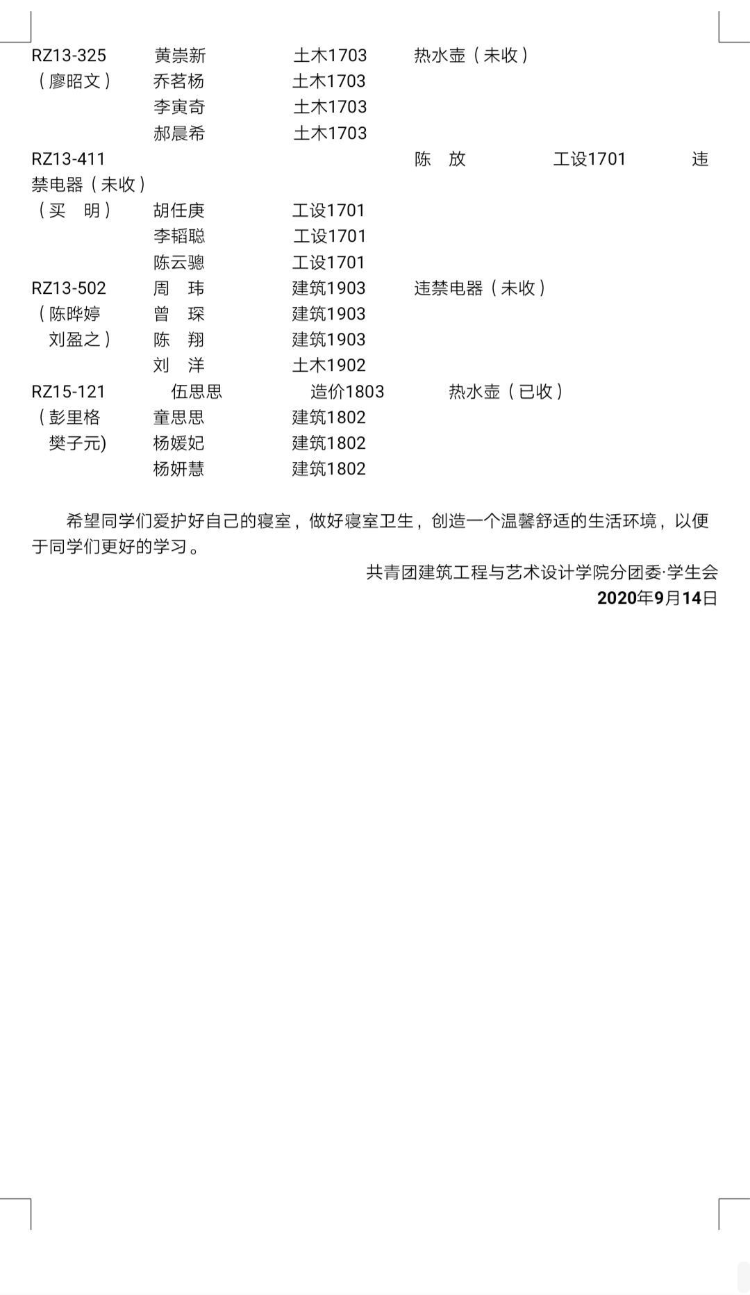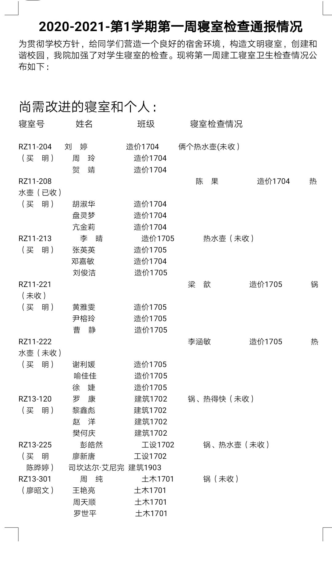 2020-2021-第1学期第一周寝室检查通报情况