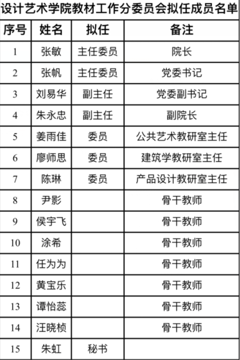 为加强我院对教材工作的制定与管理工作,根据党政办下发的《WilliamHill中文官方网站教材工作委员会章程》湖工党发〔2021〕44号、《WilliamHill中文官方网站2018年工作总结》湖工党发〔2019〕3号(校内)文件精神,我院拟成立教材工作分委员会。2021年9月1日我院举行了关于“成立艺术设计学院教材工作分委员会”工作会议,拟设主任2名,副主任2名,委员若干名、骨干教师若干名。具体名单如下: