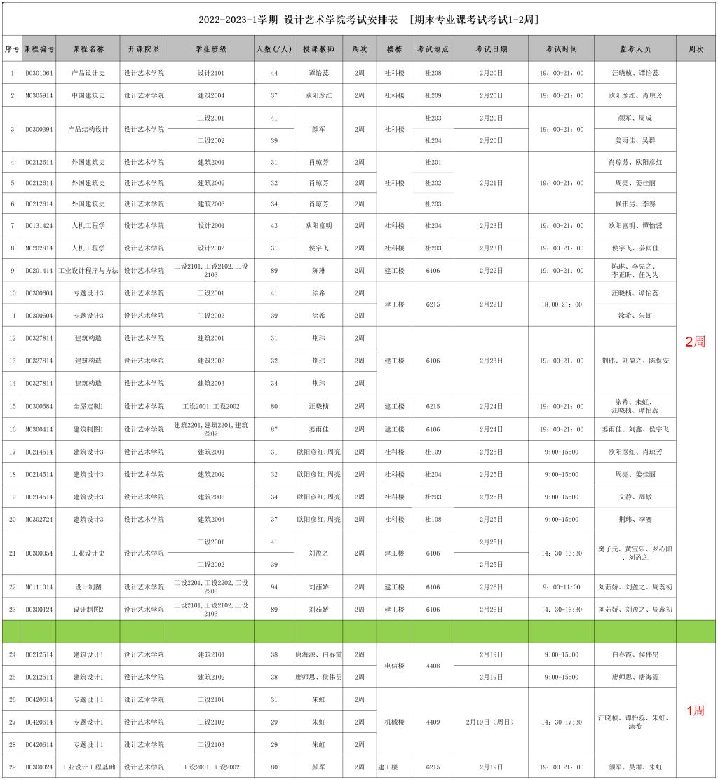2022-2023-1学期 设计艺术学院考试安排表 [期末专业课考试考试1-2周]