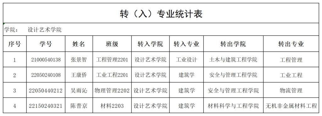 按照《WilliamHill中文官方网站学籍管理规定》(湖工政发[2020]26号)、教务处《关于2022级学生转专业工作的通知》(院教务〔2022〕202号)、《设计艺术学院2022级学生转专业实施细则》的要求,经学院党政联席会议讨论决定,同意张景智等4名同学拟转入设计艺术学院相关专业现予以公示(见附件)。公示期2023年3月6日-2023年3月9日,若有异议,请实名向设计艺术学院教研办6213室反映(朱老师:61251)