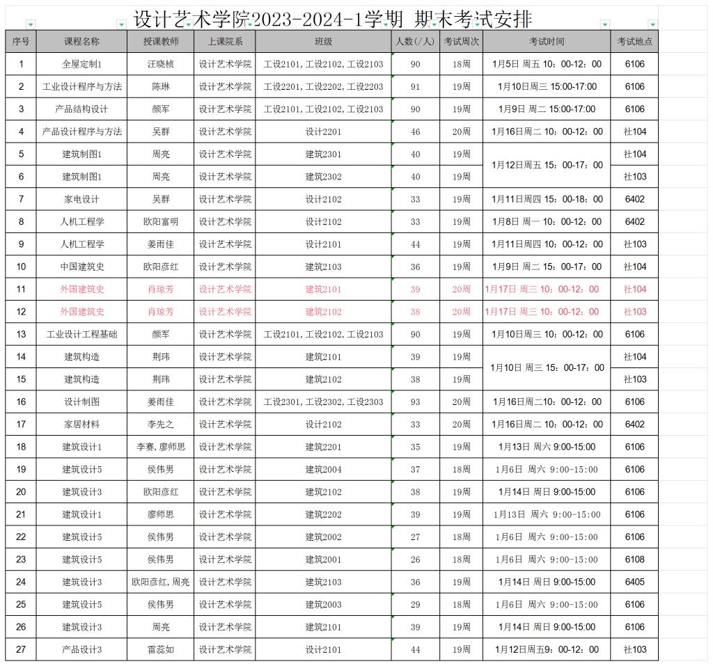 设计艺术学院2023-2024-1学期期末考试安排