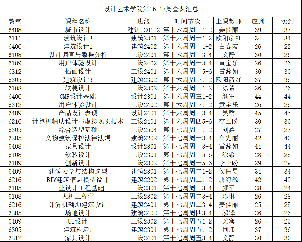 根据学院第16-17周课堂考勤数据统计,现将到课情况通报如下: