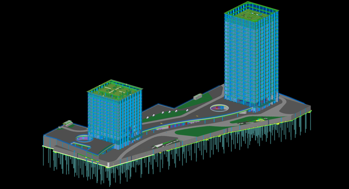 建筑高度及类别:塔楼1#栋99.75m,2#栋56.65m,裙房6.05m,地下室5.4m;一类高层办公建筑;