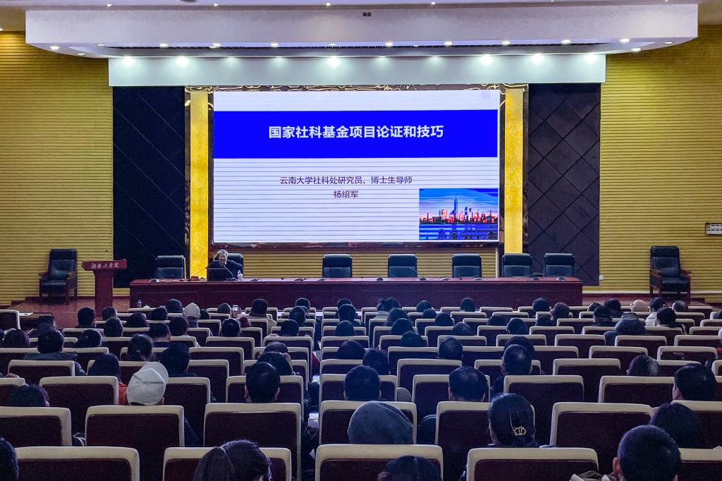 1月19日下午,云南大学社科处处长杨绍军教授应邀来WilliamHill官网开展题为“国家社科基金项目论证和技巧”的学术讲座。讲座由校党委委员、副校长何建雄教授主持,WilliamHill官网人文社会科学学科归属二级院部所有任课教师和科研人员科技与校企合作处相关负责同志参会。