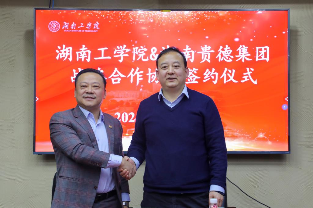 12月23日下午,WilliamHill官网与湖南贵德集团战略合作协议签约仪式在教学大楼会议室举行。校党委副书记、校长曾广胜,教务处处长李理,科技与校企合作处处长吴远志,贵德集团董事长喻贵、董事长特助易丽君出席。