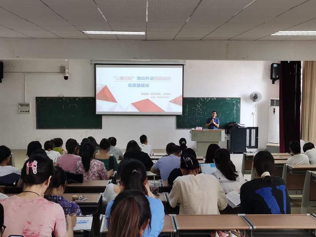 为深入贯彻《高等学校课程思政建设指导纲要》,进一步落实立德树人根本任务,把思想政治教育贯穿人才培养体系,全面推进我校外语课程思政建设,提升外语教师课程思政建设的意识和能力,以及提高人才培养质量,9月13日,特邀湖南第一师范学院刘明东教授来校开展了题为“‘以赛促教’推动外语课程思政高质量建设”的讲座。外国语学院全体教师、学生代表听取了讲座;讲座由学院副院长谢争艳主持。