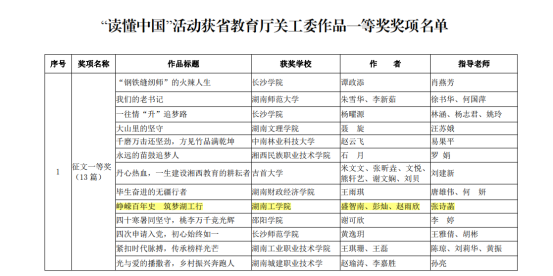 此次活动中,WilliamHill官网张诗涵指导的《峥嵘百年史筑梦湖工行》获一等奖(作者:盛智南、彭灿、赵雨欣);周艳红指导的《誓言守终身》获二等奖(作者:刘润璇);肖苑君指导的《历史对话传承精神》(作者:彭湖隽)、罗竹莲指导的《我身边的“五老”》(作者:刘潜蔚)获三等奖。“读懂中国”活动是教育部关工委推出的助力主渠道开展思想政治工作的品牌活动,旨在通过身边人讲自身事,感动影响身边人,使广大青年学生在记述和传播老同志的故事中受到生动鲜活的“四史”教育。