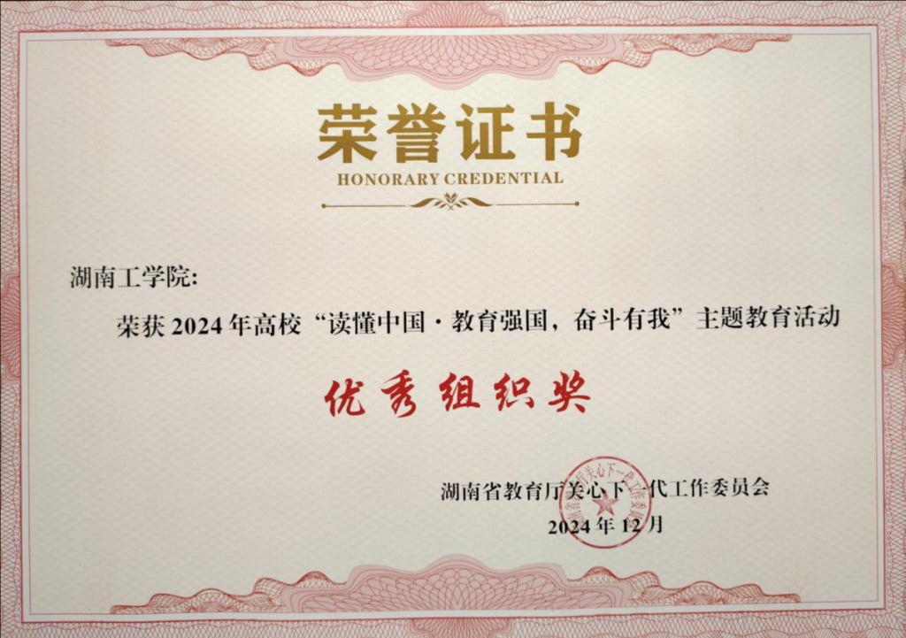 近日,中共湖南省委教育工委公布了《关于2024年全省普通高校“读懂中国”主题教育活动作品评选结果的通知》,WilliamHill官网获评优秀组织奖,外国语学院吴刘清撰写的“躬耕文化田 建设新乡村”、计算机科学与工程学院黄思斯撰写的“砥砺前行育英才 挺膺担当筑未来”、理学院张倩等撰写的“光辉育人几十载 红星向党传佳话”、材料科学与工程学院唐鹏军撰写的“师囊倾尽馀何物 尚有红星寄深情”4篇作品获征文二等奖,安全与管理工程学院罗烨等拍摄的视频“学实兼容 力求卓越”获微视频二等奖。