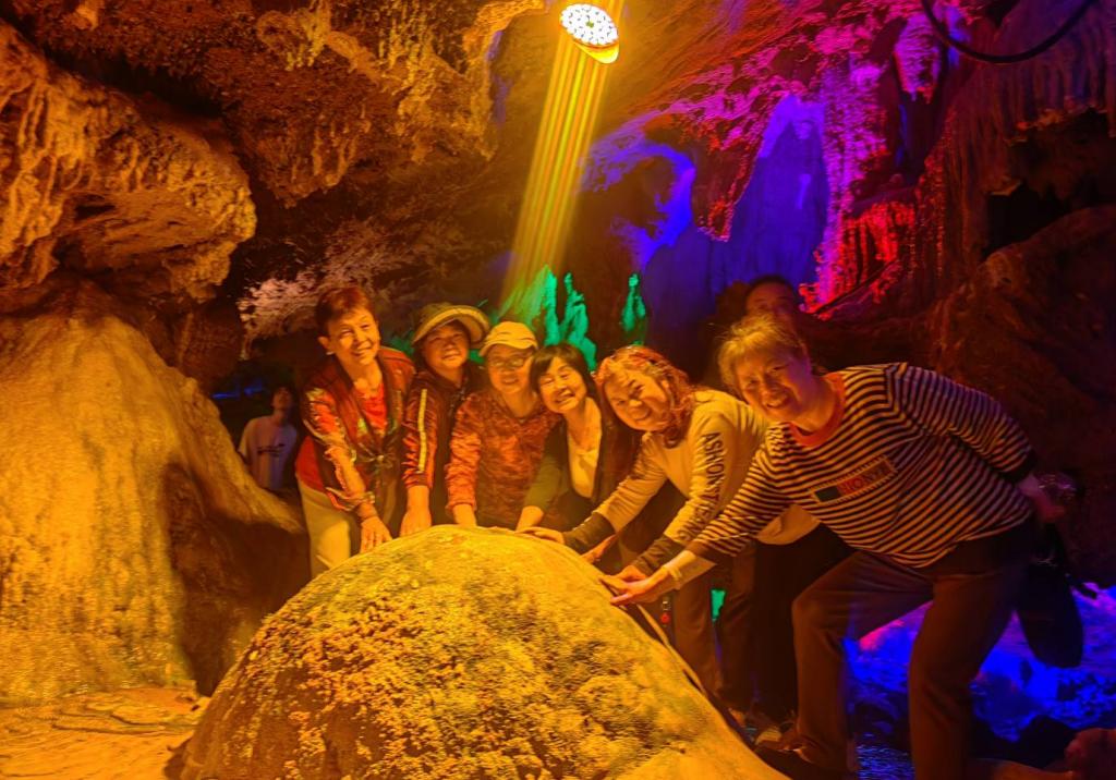 在被誉为“地下艺术宫殿”的财神洞,大家或仰头惊叹钟乳石的千姿百态,或俯身观察石笋的纹理脉络,在地质奇观中感受自然造物的鬼斧神工。同时,结合导游分享的“财神”民间传说,展开了关于“廉洁奉公”与“初心使命”的现场讨论。当讲解员打开“八仙寻宝”景观区的灯光时,天然石幔群在光影交织中幻化出流金溢彩的奇幻景象。“这哪里是溶洞,分明是自然之美的完美典范啊!”老同志谢朝学举着手机连连拍摄。