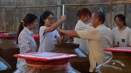 在模拟操作过程中,大家小心翼翼地取下蒲包,轻轻地将精心发酵的曲米倒出,用力地将曲米捣碎,顺时针用杨柳棍搅醋49次......这些看似简单的操作,却需要严格按照时令节气,历时百余天,不能有丝毫差错,处处体现着传统文化的魅力。