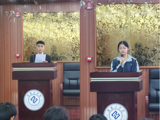 物理2302班邓晓根作为国家助学金受助学生代表发言,他结合自身经历,坦言家庭经济曾面临困难,是国家助学金为他缓解了经济压力,更在精神上给予他坚定前行的力量,他动情的说道:“这份资助不仅是物质上的支持,更是国家和学校对我们沉甸甸的期望,今后将以实际行动回报社会。”信息2301班蒋佳乐作为国家励志奖学金获得者代表,分享她在学业与学生工作之间平衡成长的经历,她始终坚持“诚信聚人心,高效补短板”的信念,在专业学习和综合测评均取得专业第一的好成绩,还多次带领团队参赛,取得优异成绩。最后说道:“诚信是我们前行的‘压舱石’,感恩是我们内心的‘加油站’。国家励志奖学金是一份荣誉,更是一份责任,激励我们不断向前。”