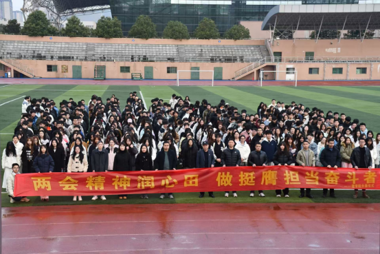 3月17日清晨院于校园北田径场举行“两会精神润心田,做挺膺担当奋斗者”主题升旗仪式。理学院党委书记刘璟忠、院长谢忠祥、副院长邓元祥、党委副书记傅娜、学工办主任兼分团委书记任静、辅导员、班主任学院全体学生参与此次升旗仪式,仪式由理学院统计2401班的罗海梅同学主持