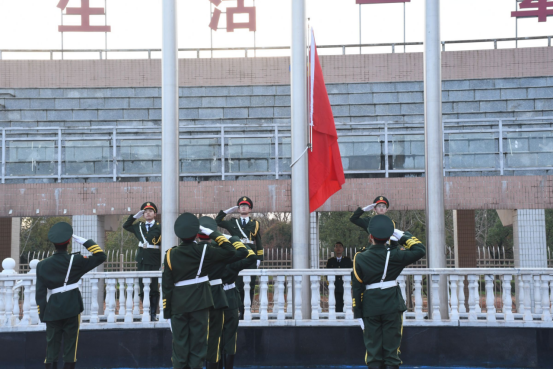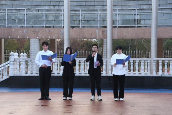 7点,升旗仪式准时开始,护旗手正步护送国旗至升旗台。国歌奏响,升旗手扬旗,五星红旗缓,全体师生行注目礼之后,由统计2401李慧妍、统计2401魏宏运、物理2402高睿、物理2401刘秉鑫四位同学带领全体同学进行诗朗诵《以青春之名,筑强国之梦》