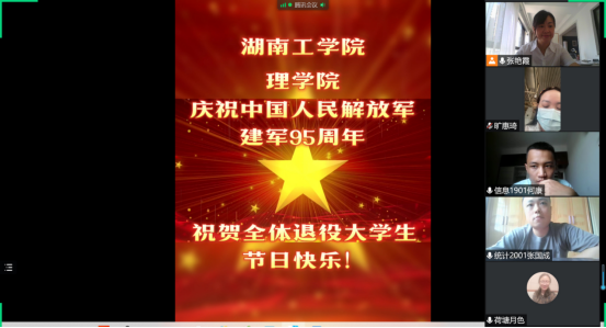 “八一”建军节来临之际,8月1日上午,理学院党委副书记何雪华、学工办主任张艳霞、辅导员旷惠琦通过网络“云慰问”这一特殊的方式向理学院退役大学生信息1901班何康、统计2001班张国成两位同学送上了学院的关怀并致以诚挚的节日问候。