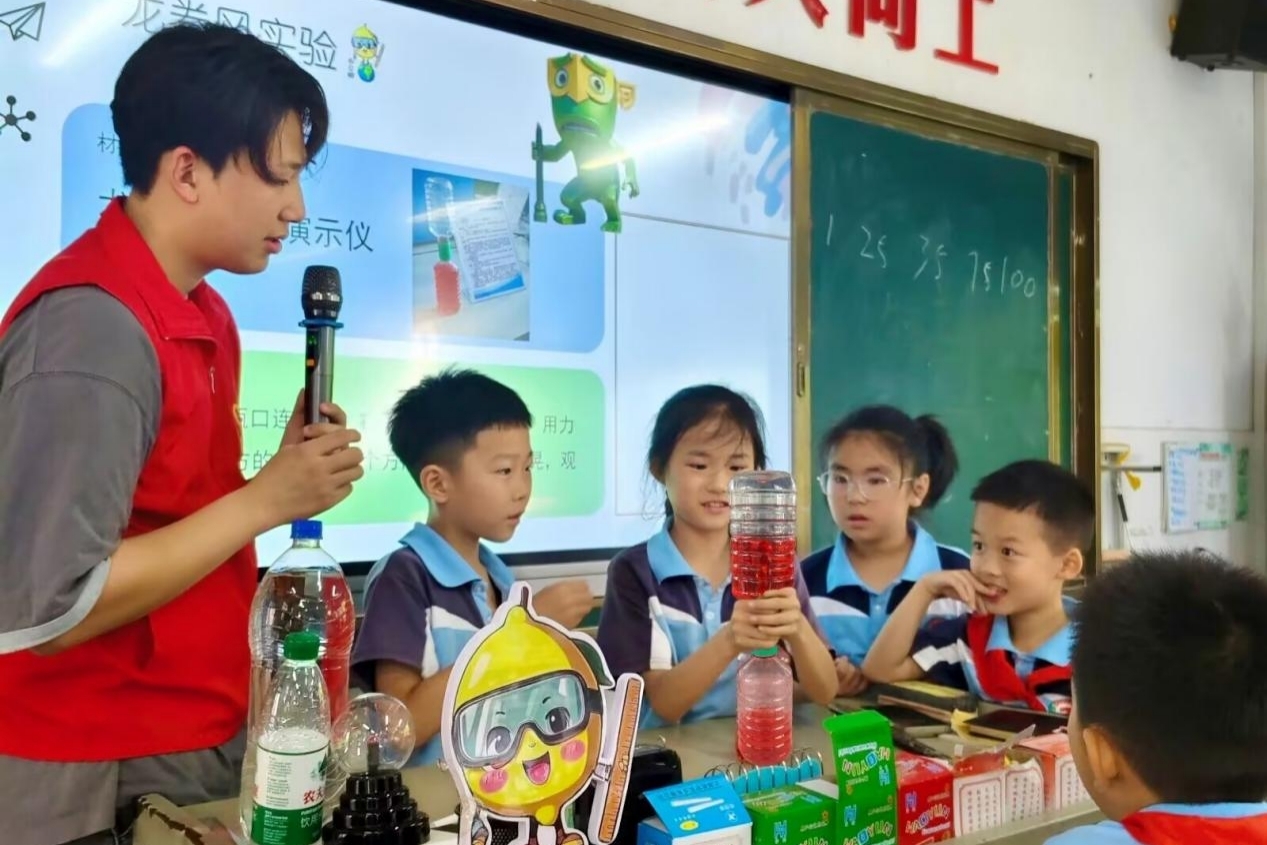 6月5日,理学院“小青理”科普团队走进祝融小学,为三年级学生带来“烟囱效应”“自制饮水机大挑战”和“辉光球实验”等五个趣味科学实验,用生动课堂点燃孩子们的科学探索热情。